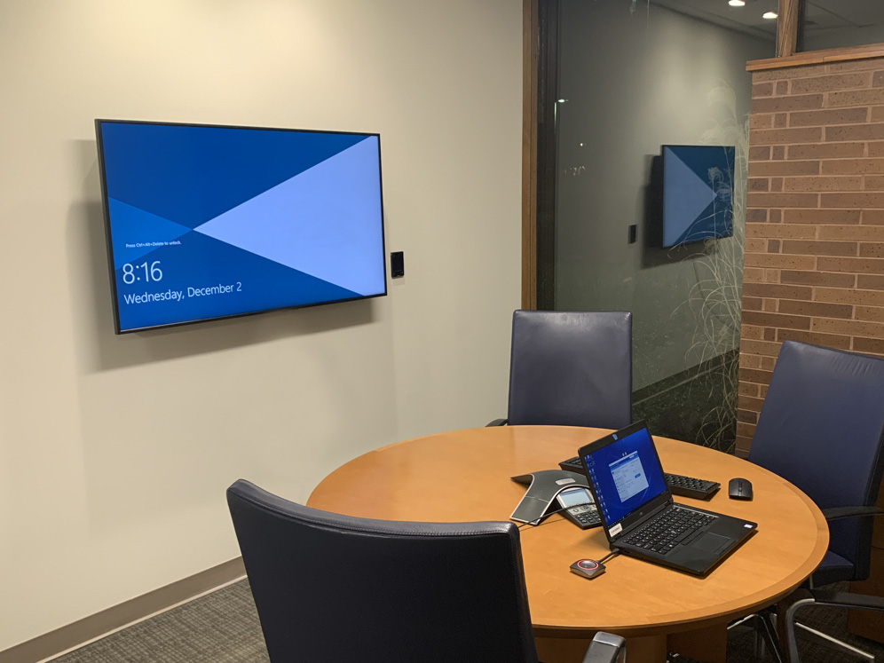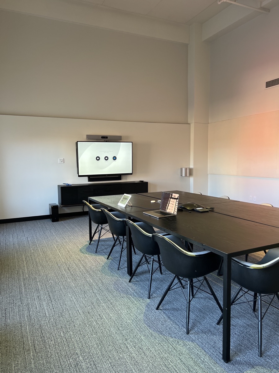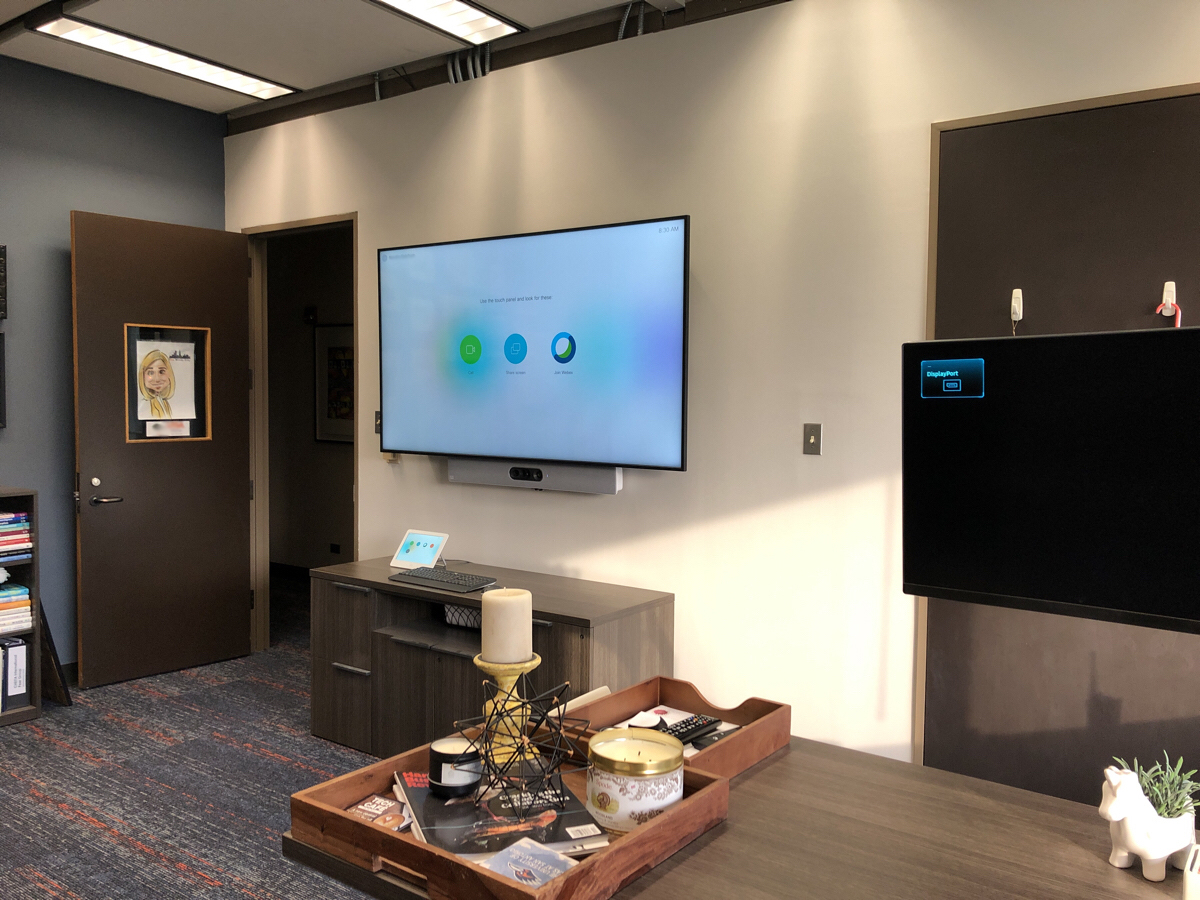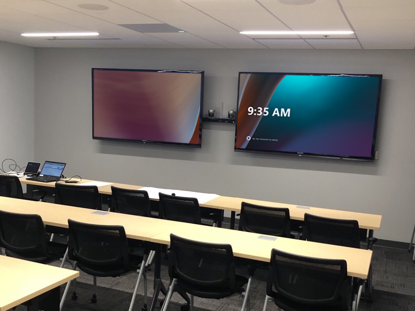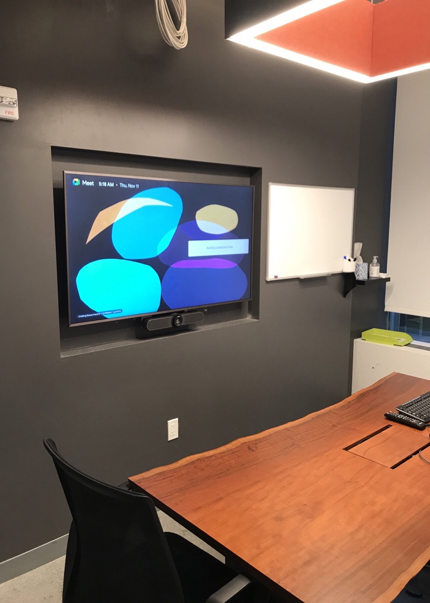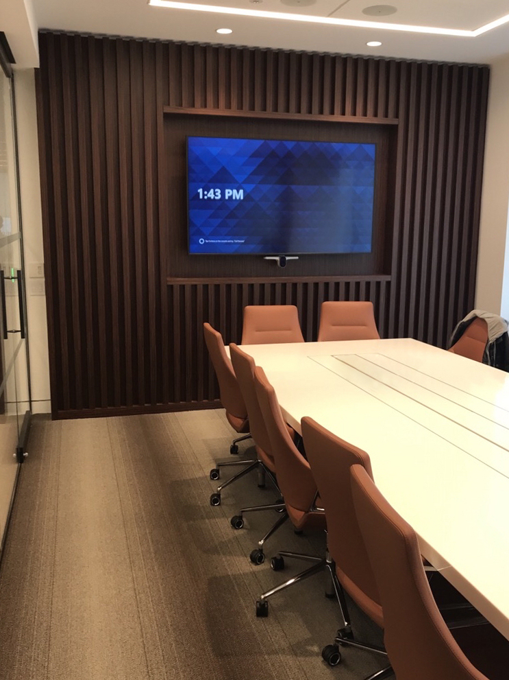 A Boardroom featuring a 98″ Display, and two Cisco Quad Cameras positioned at angle on custom millwork to eliminate any gaps in the video pick up. The space features three primary zones of speakers and a fourth zone for overflow so that users can hear clearly, while additional ceiling microphones ensure clear audio pick up so remote attendees aren’t missing anything.