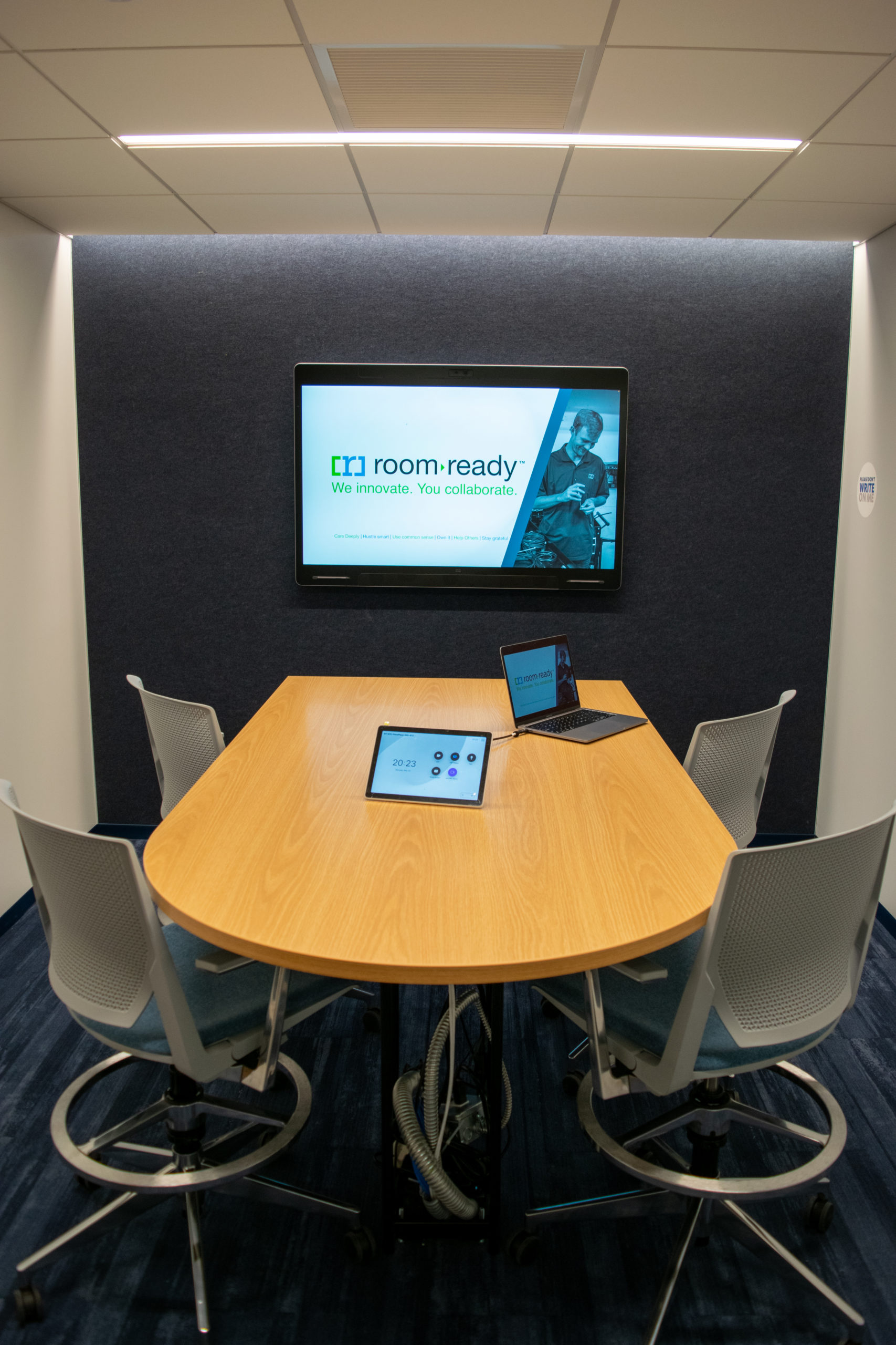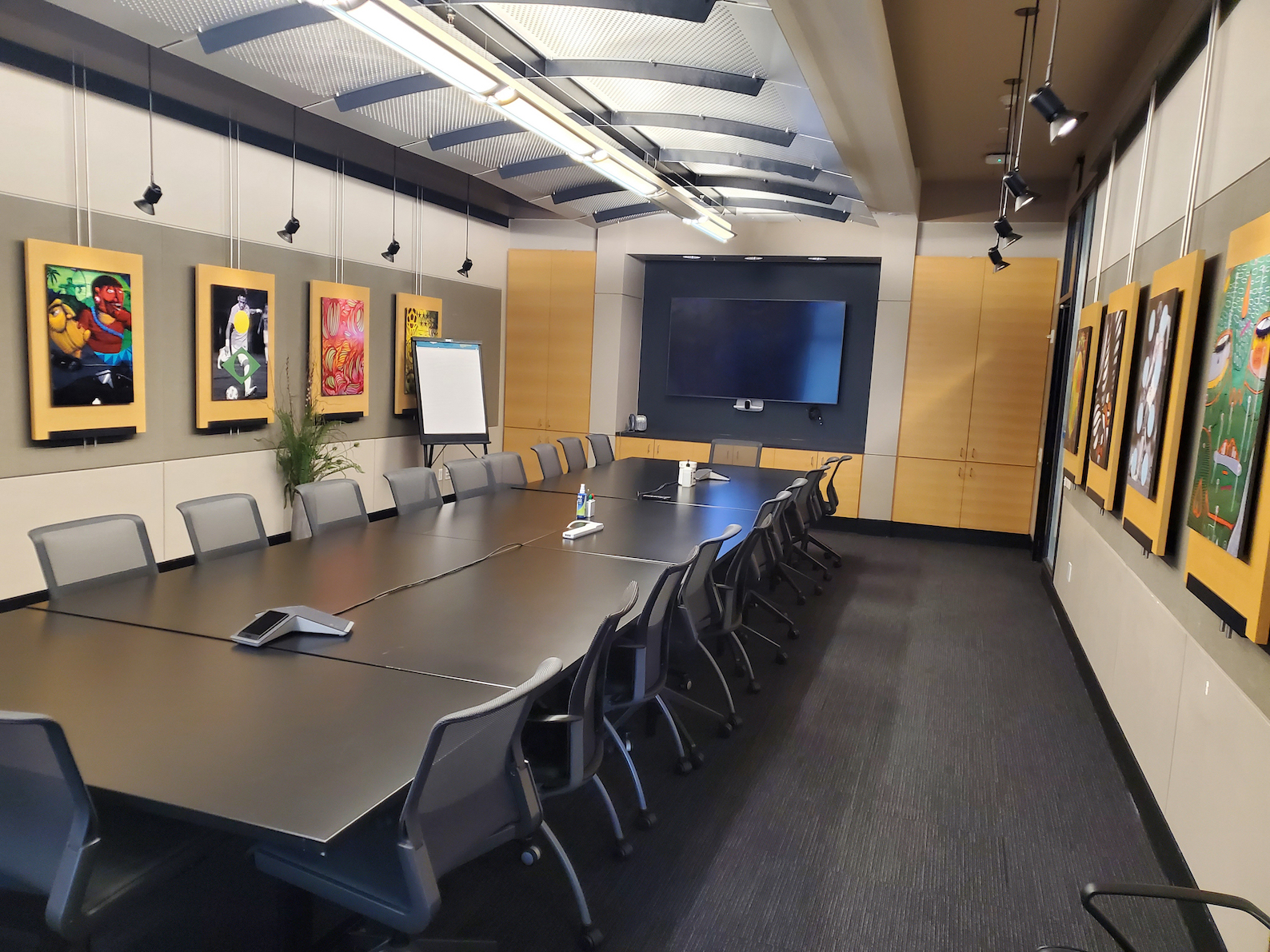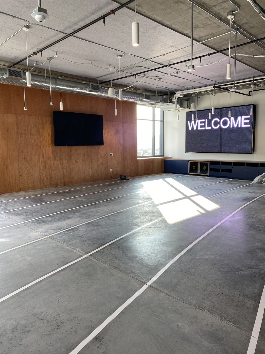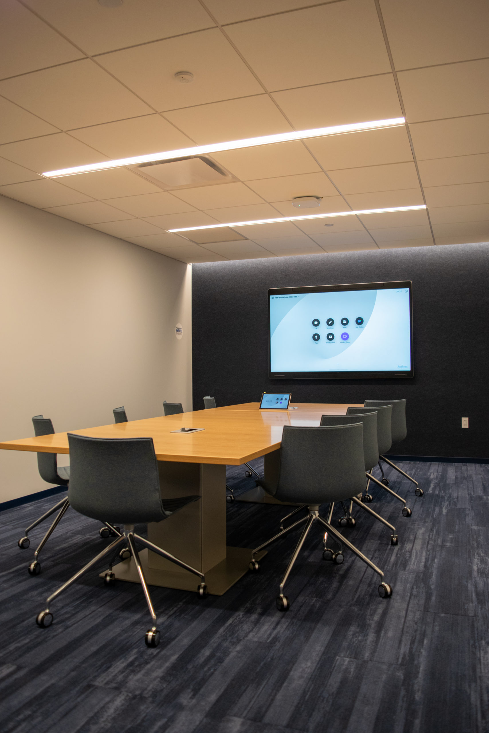 A Boardroom featuring a 98″ Display, and two Cisco Quad Cameras positioned at angle on custom millwork to eliminate any gaps in the video pick up. The space features three primary zones of speakers and a fourth zone for overflow so that users can hear clearly, while additional ceiling microphones ensure clear audio pick up so remote attendees aren’t missing anything.