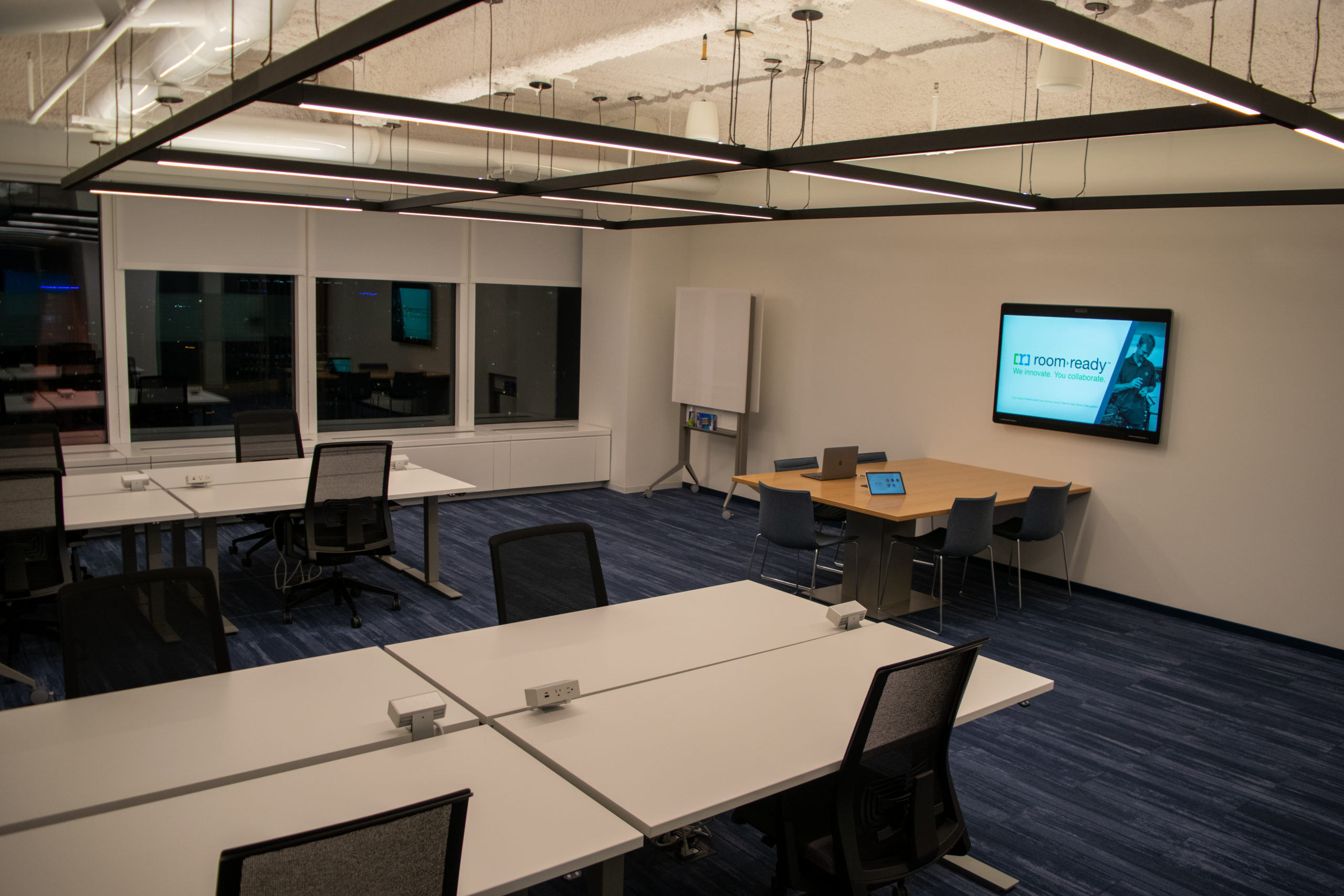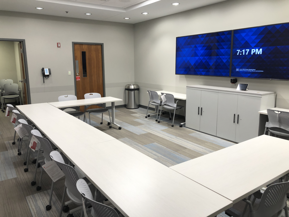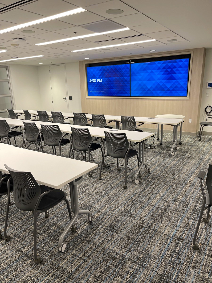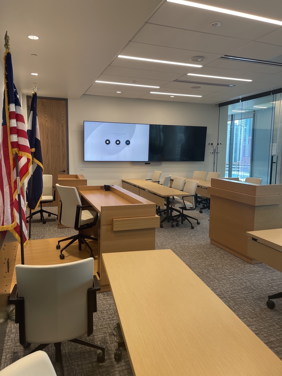 A mock court room designed to help lawyers, legal professionals and clients prepare for upcoming litigation. The room is equipped with dual 85″ displays and in-ceiling speakers & microphones for superior audio quality. The Cisco Room Kit Plus brings Webex video conferencing to the space and allows experts and team members to join sessions remotely. The solution also features the ability to record each session, and BYOD functionality.