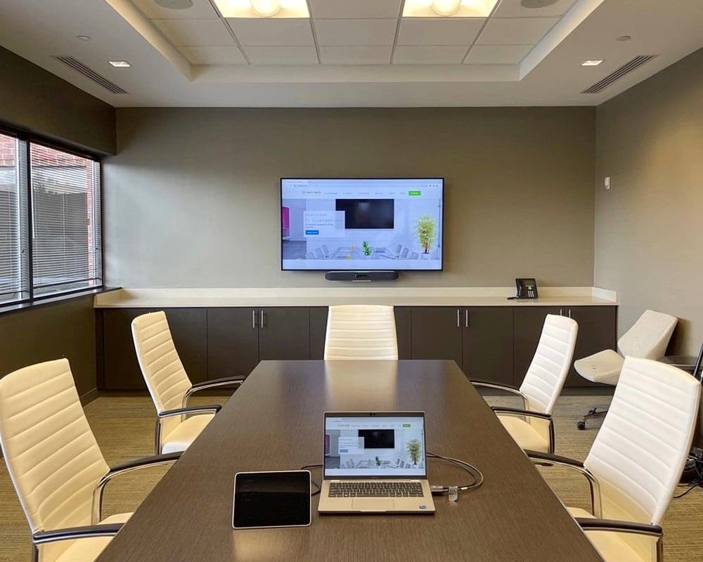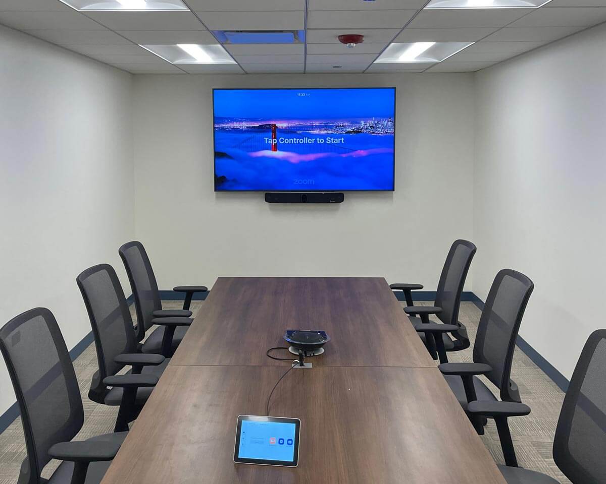 This Microsoft Teams solution features the Poly Studio X50 video bar, providing advanced camera capabilities and noise-blocking technology. While the addition of a Sennheiser TeamConnect 2 Ceiling Microphone and four Sonance In-Ceiling Speakers ensure that everyone in the meeting is heard.