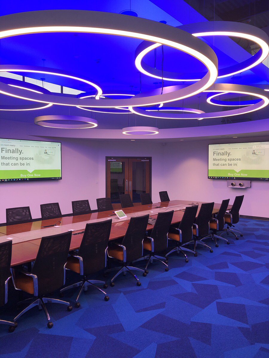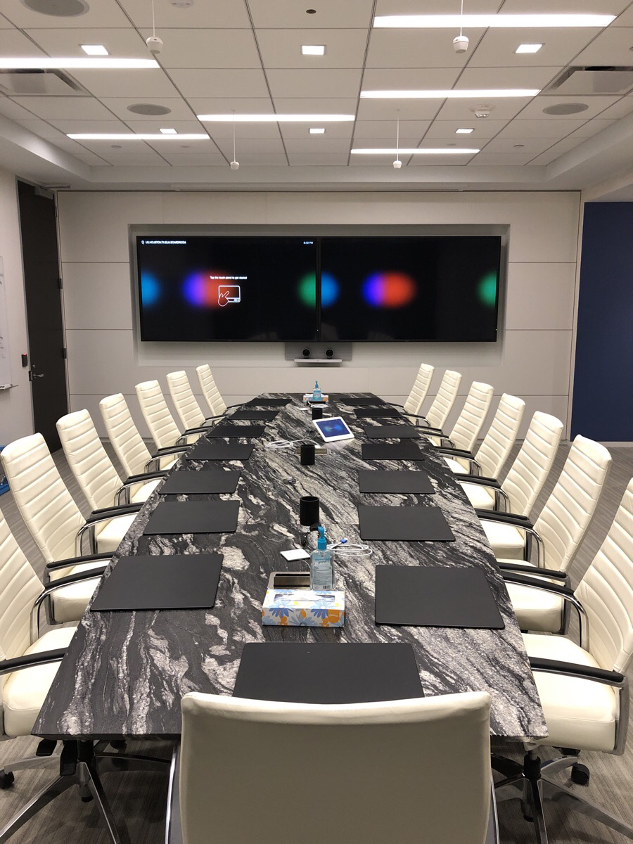 A Boardroom featuring a 98″ Display, and two Cisco Quad Cameras positioned at angle on custom millwork to eliminate any gaps in the video pick up. The space features three primary zones of speakers and a fourth zone for overflow so that users can hear clearly, while additional ceiling microphones ensure clear audio pick up so remote attendees aren’t missing anything.