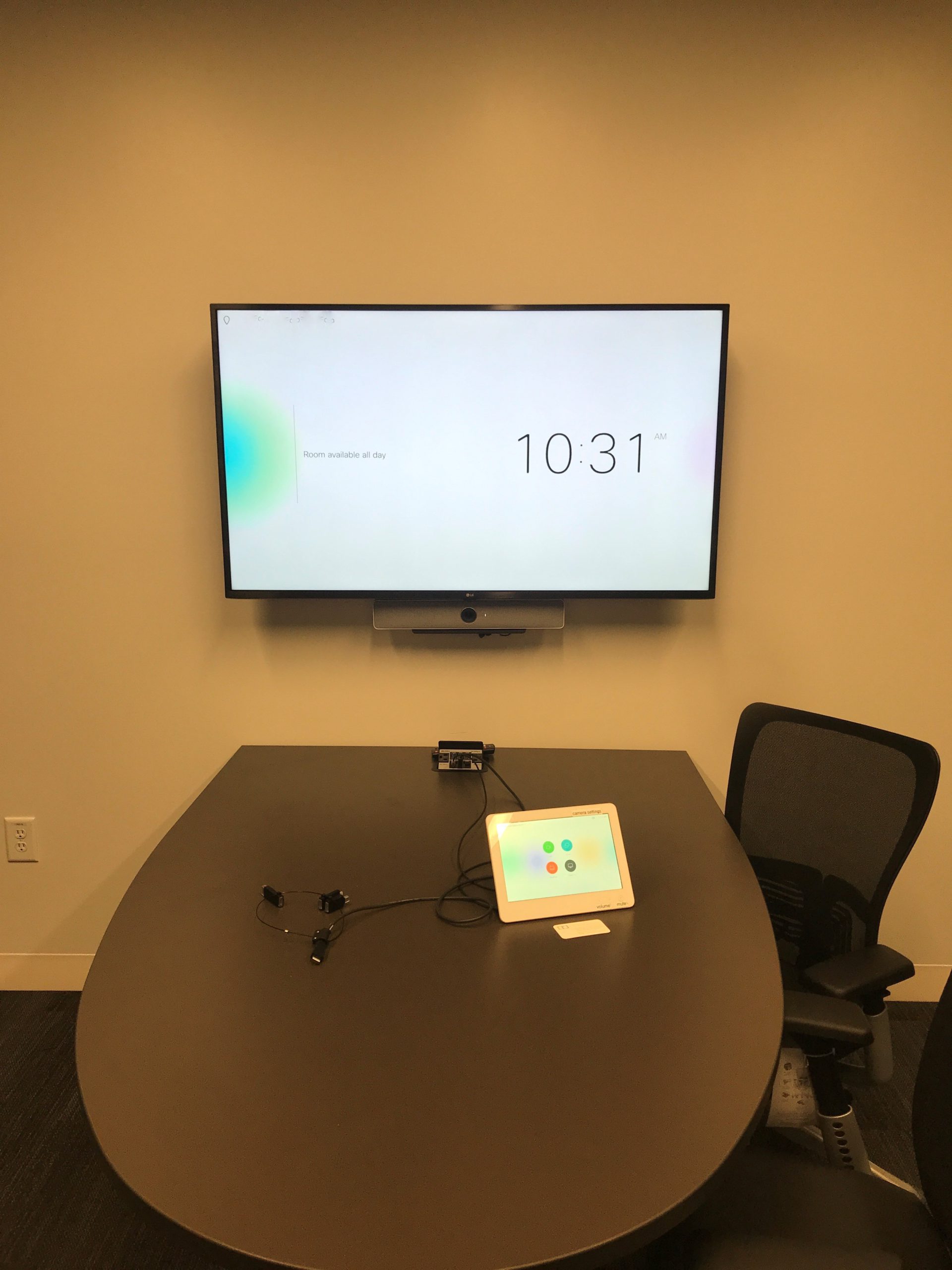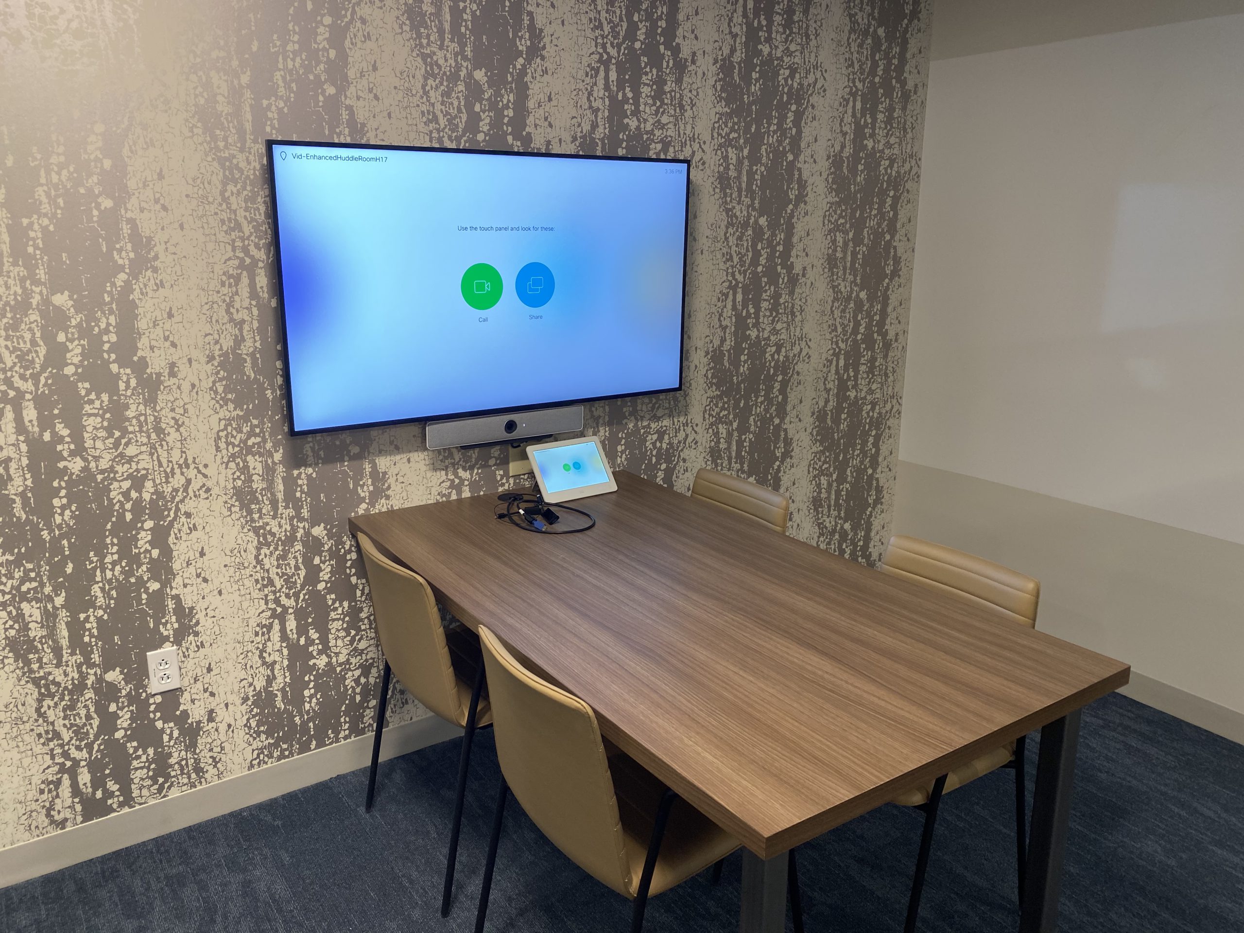 A 55″ WebexBoard Pro in a huddle room that is enabled for Microsoft Teams and Webex meetings. A Cisco Webex Navigator Touch Panel on the table provides meeting controls, and an additional BYOD passthrough allows users to connect to meetings on any platform.