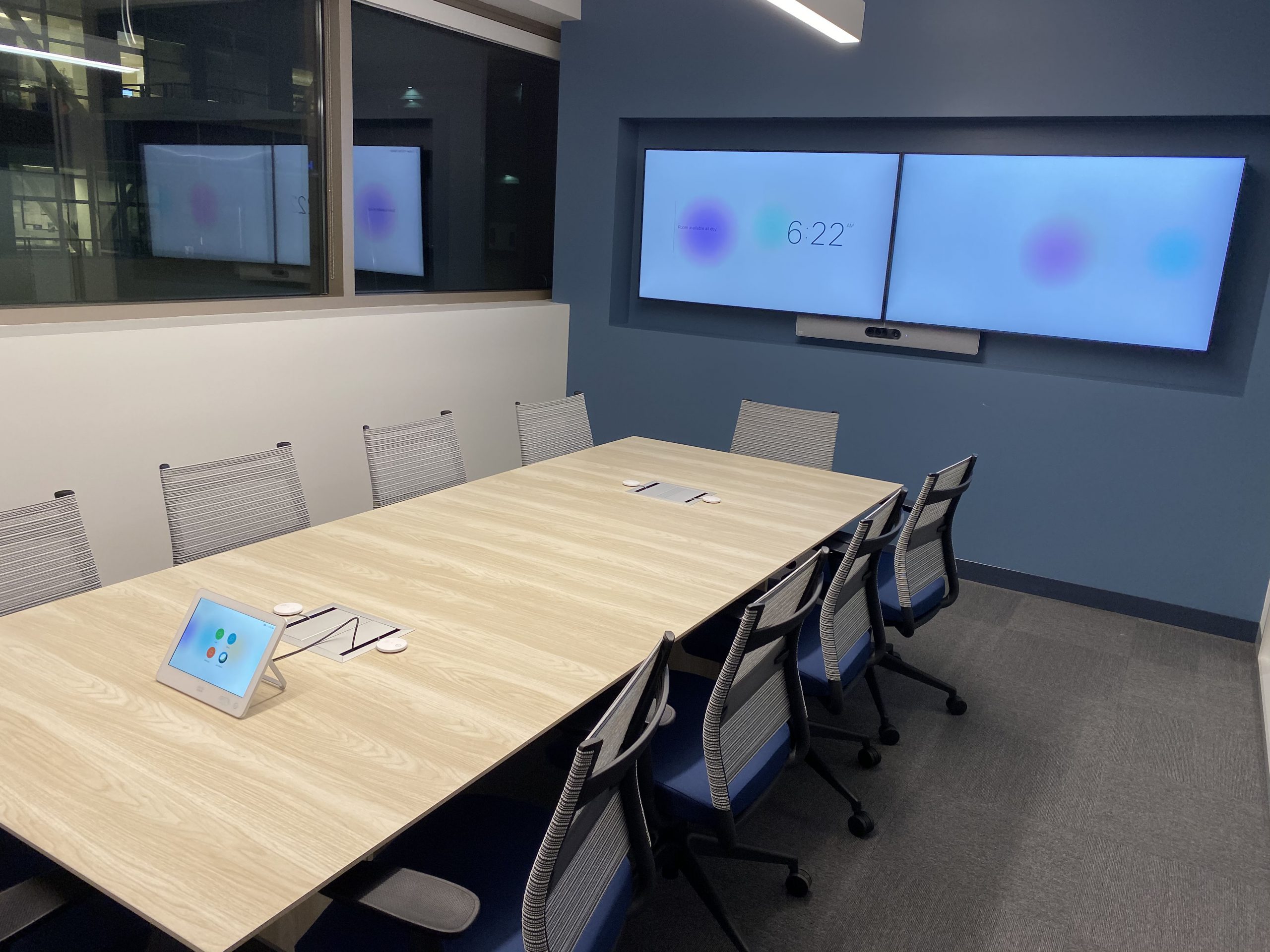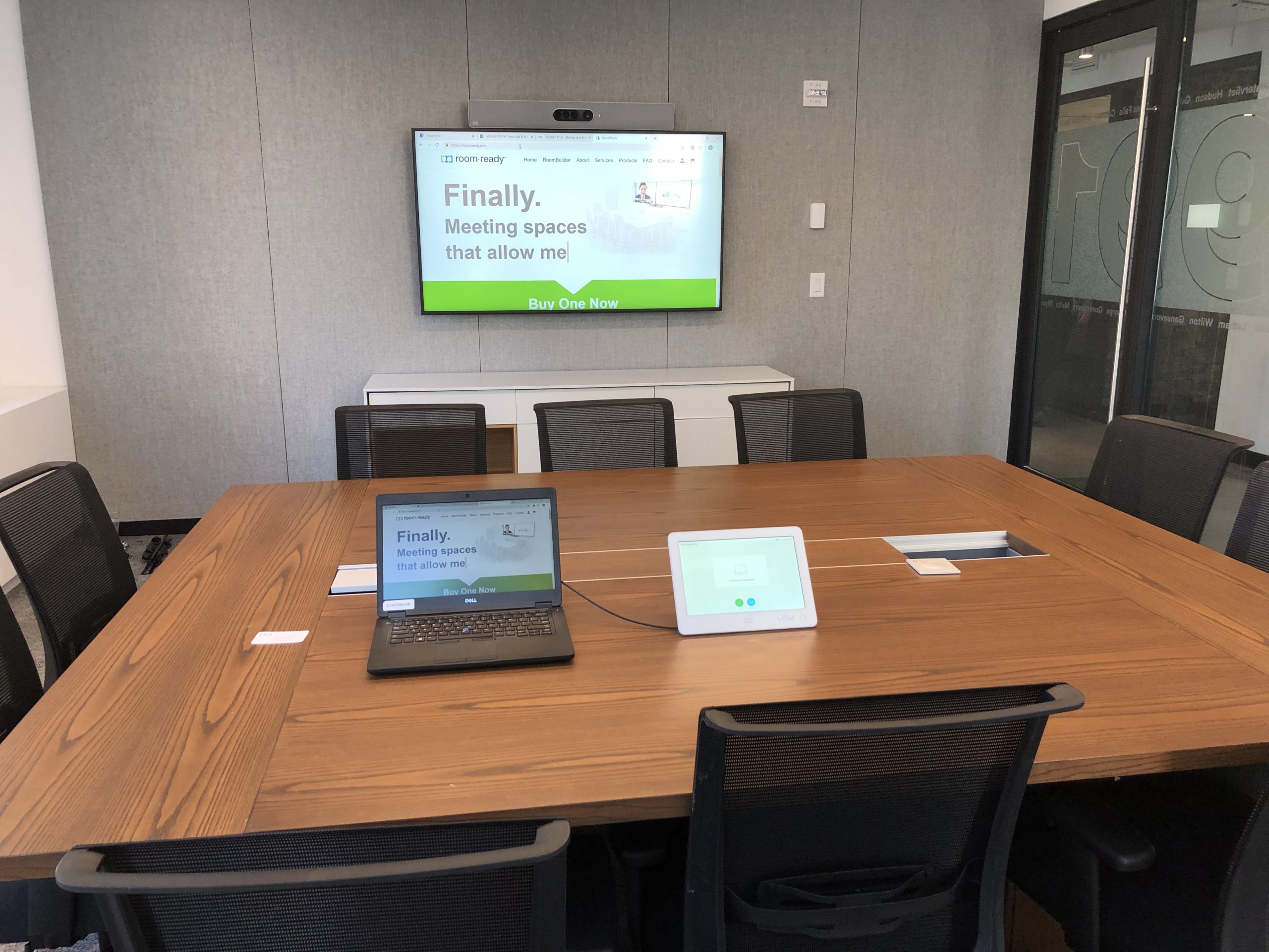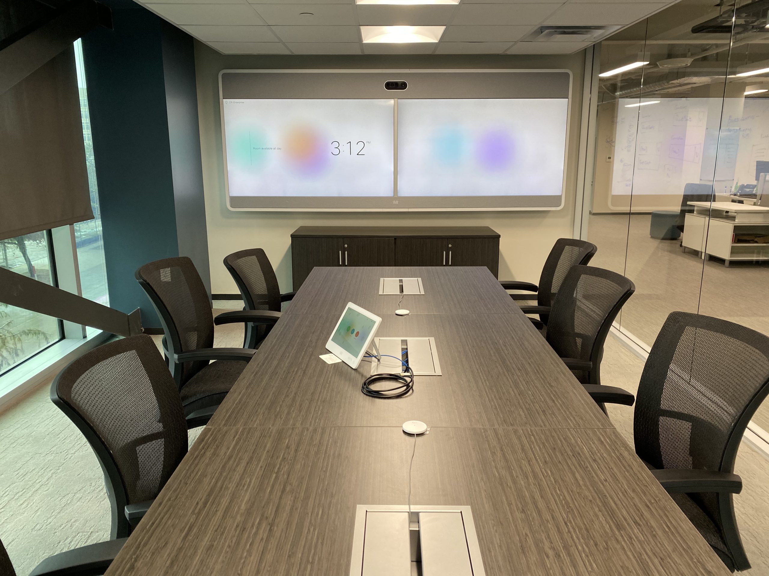 A 75″ WebexBoard Pro in a medium sized conference room that is enabled for Microsoft Teams and Webex meetings. A Cisco Webex Navigator Touch Panel on the table provides meeting controls, and an additional BYOD passthrough allows users to connect to meetings on any platform.