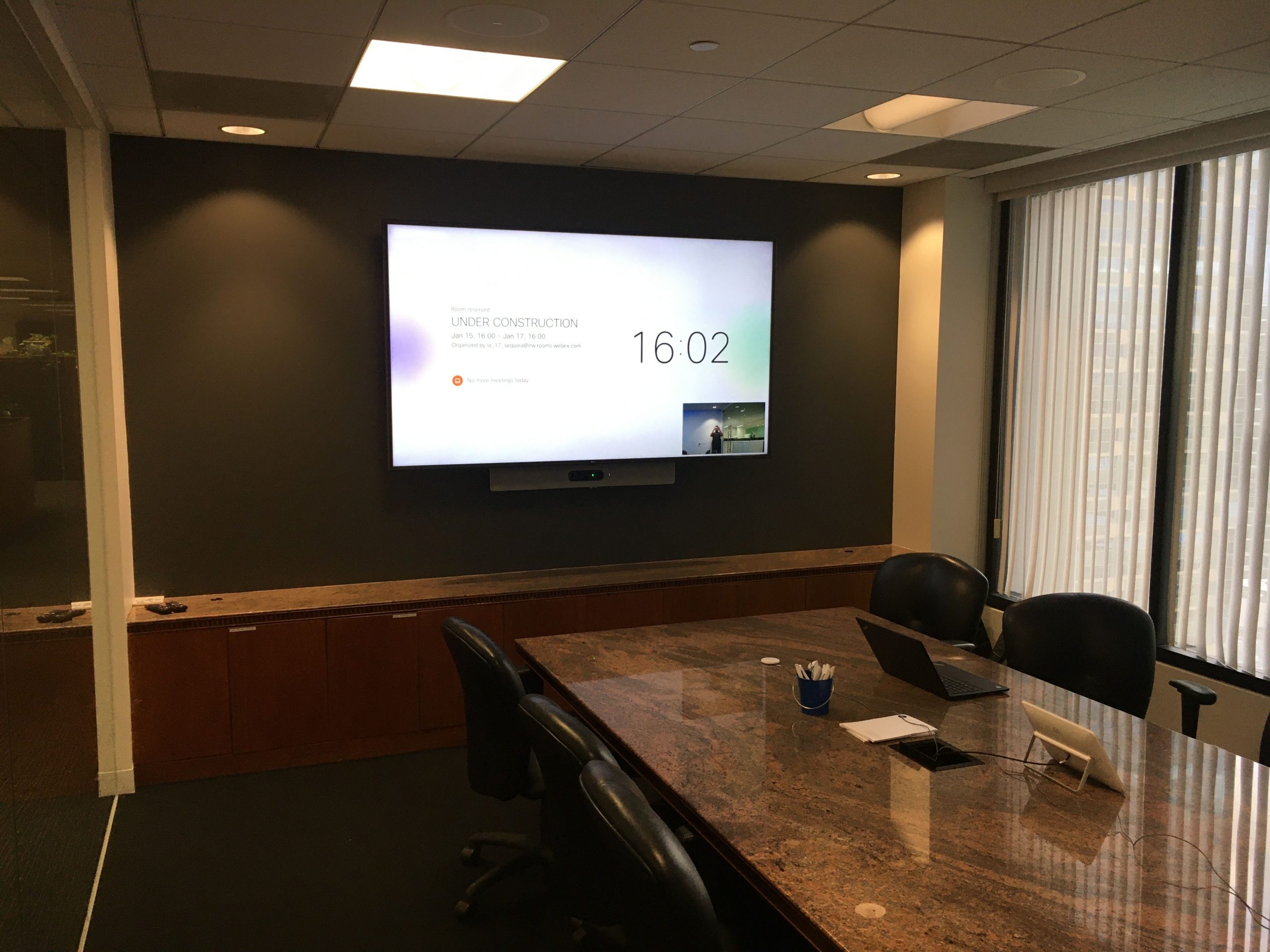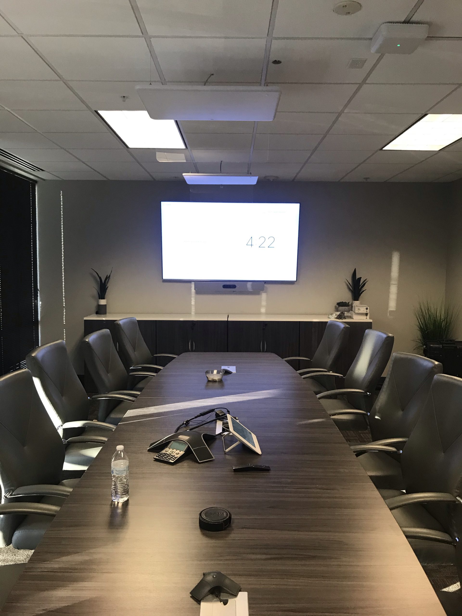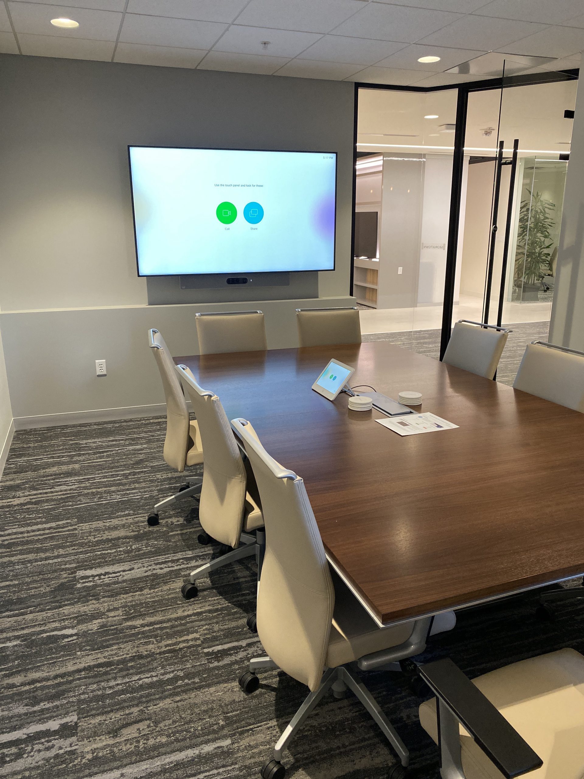 A 75″ WebexBoard Pro in a medium sized conference room that is enabled for Microsoft Teams and Webex meetings. A Cisco Webex Navigator Touch Panel on the table provides meeting controls, and an additional BYOD passthrough allows users to connect to meetings on any platform.